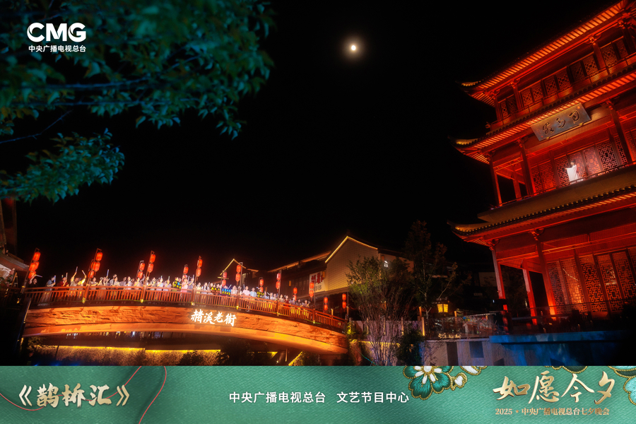 在赭溪老街,晚会打破传统中心舞台局限,以“带状临河场景”构建沉浸式体验,天台的景致与节目深度交融。歌曲《鹊桥汇》中,高低错落的老街空间成为“诗画载体”。前奏响起时,浙江省话剧院演员刘建福扮演的“李白”现身老街司马阁,吟诵“龙楼凤阙不肯住,飞腾直欲天台去”。镜头随“李白”目光转向拱桥,众人齐诵七夕诗词,随后黄子弘凡、欧阳娜娜在水面舞台分区互动,老街的层次空间让“全民共庆七夕”的场景更显生动。
